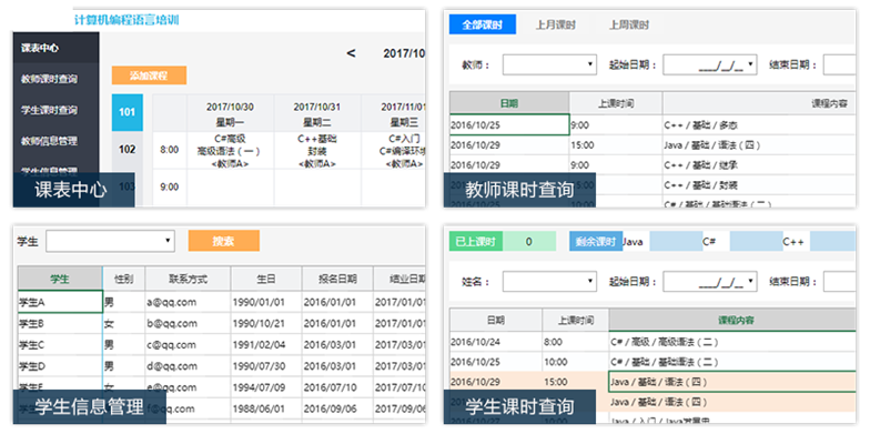 - 課表中心,根據日歷時間安排課程,并分配老師。