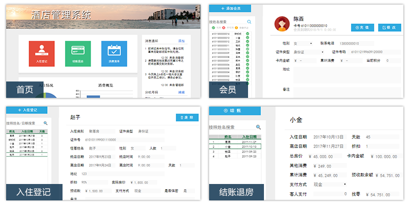 酒店管理系統是酒店行業(yè)信息化管理的輔助軟件,旨在從信息化的角度,幫助酒店管理者提高管理效率,從而提高酒店經營利潤。酒店管理演示系統主要包括酒店會員管理、酒店客房中心、房客入住及結賬等模塊。