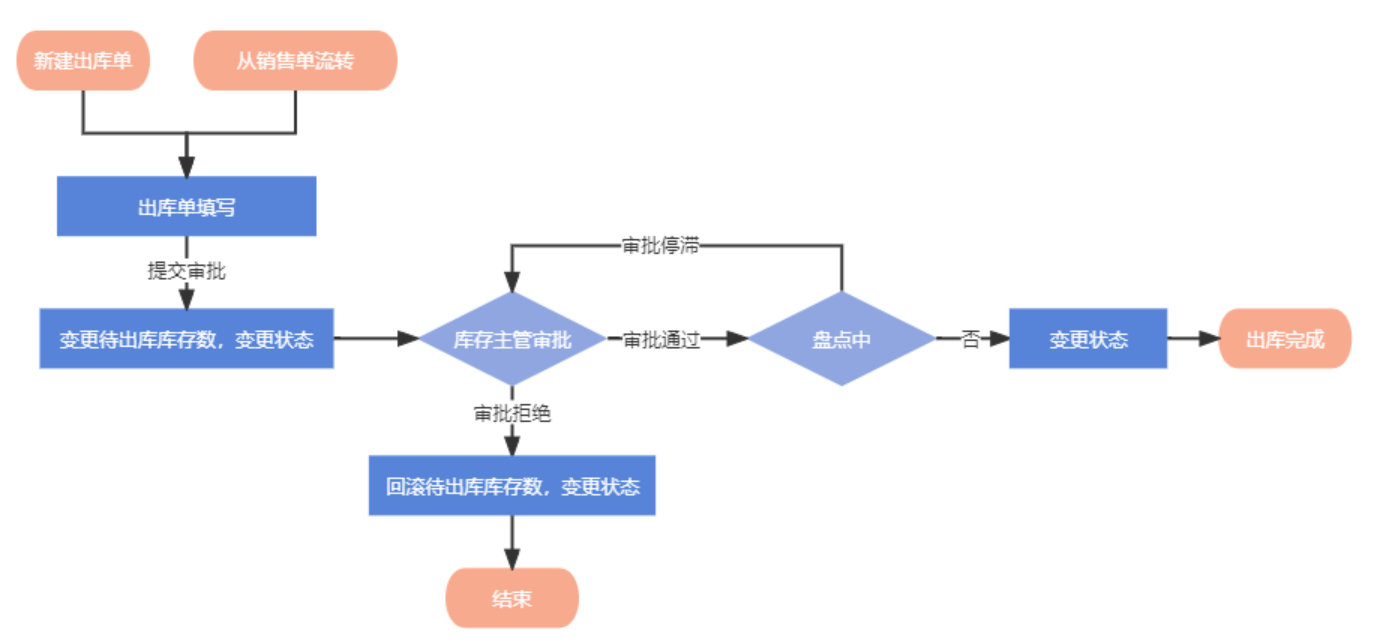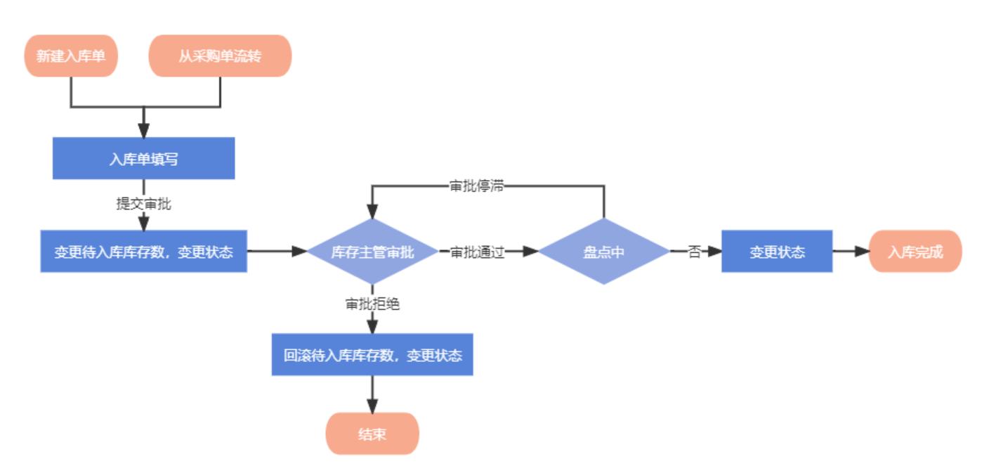 出入庫管理:對物品出入庫信息的增刪改查,提供了審批流程。其中,出入庫創(chuàng)建入口較多,除新建外還包含了從采購單、從銷售單、從盤點(diǎn)單的流轉(zhuǎn)。