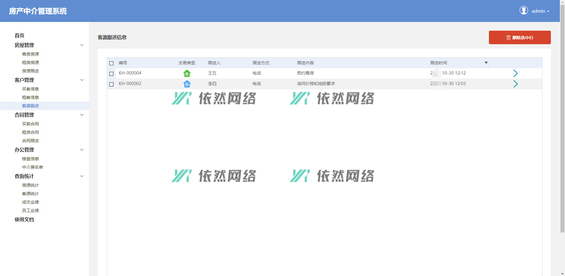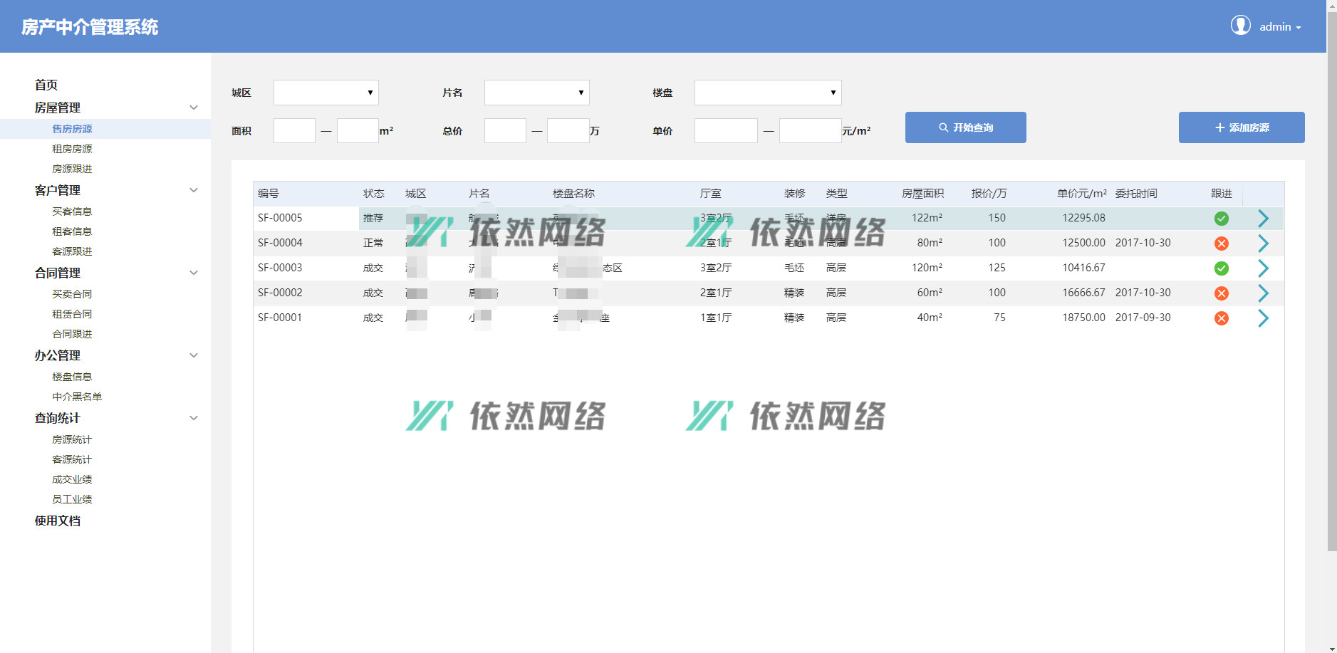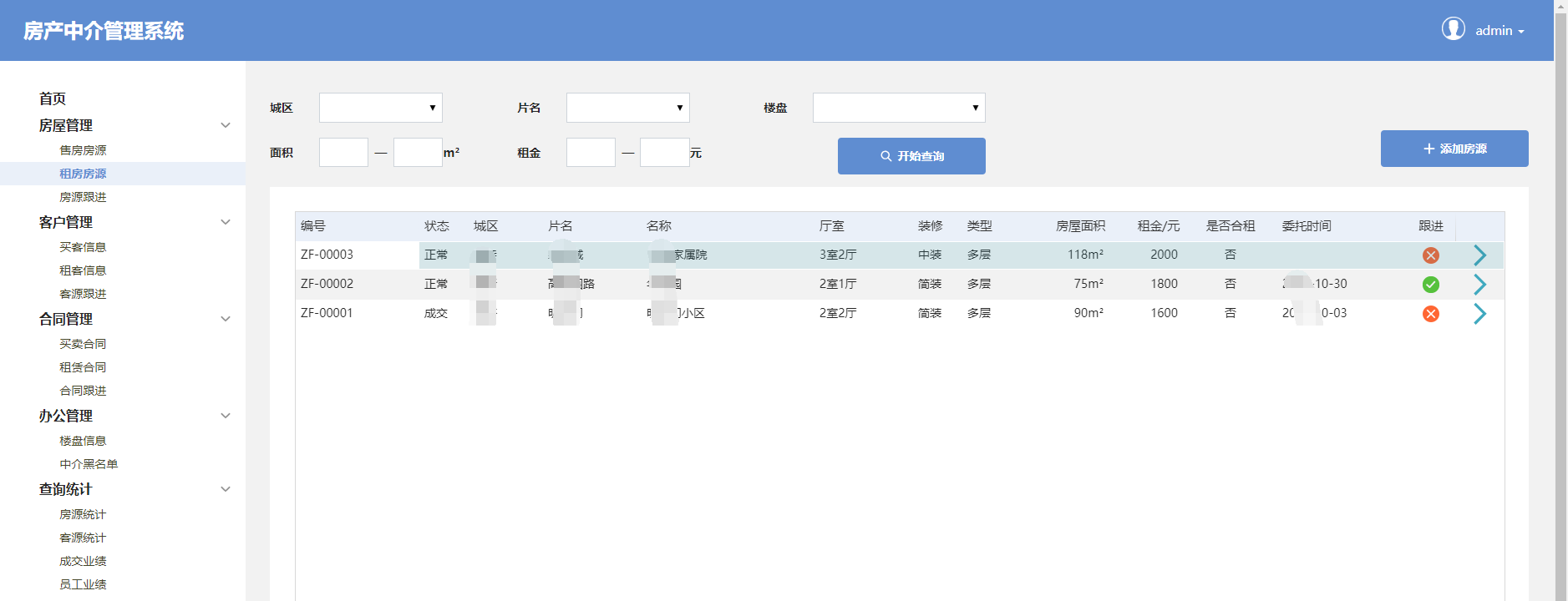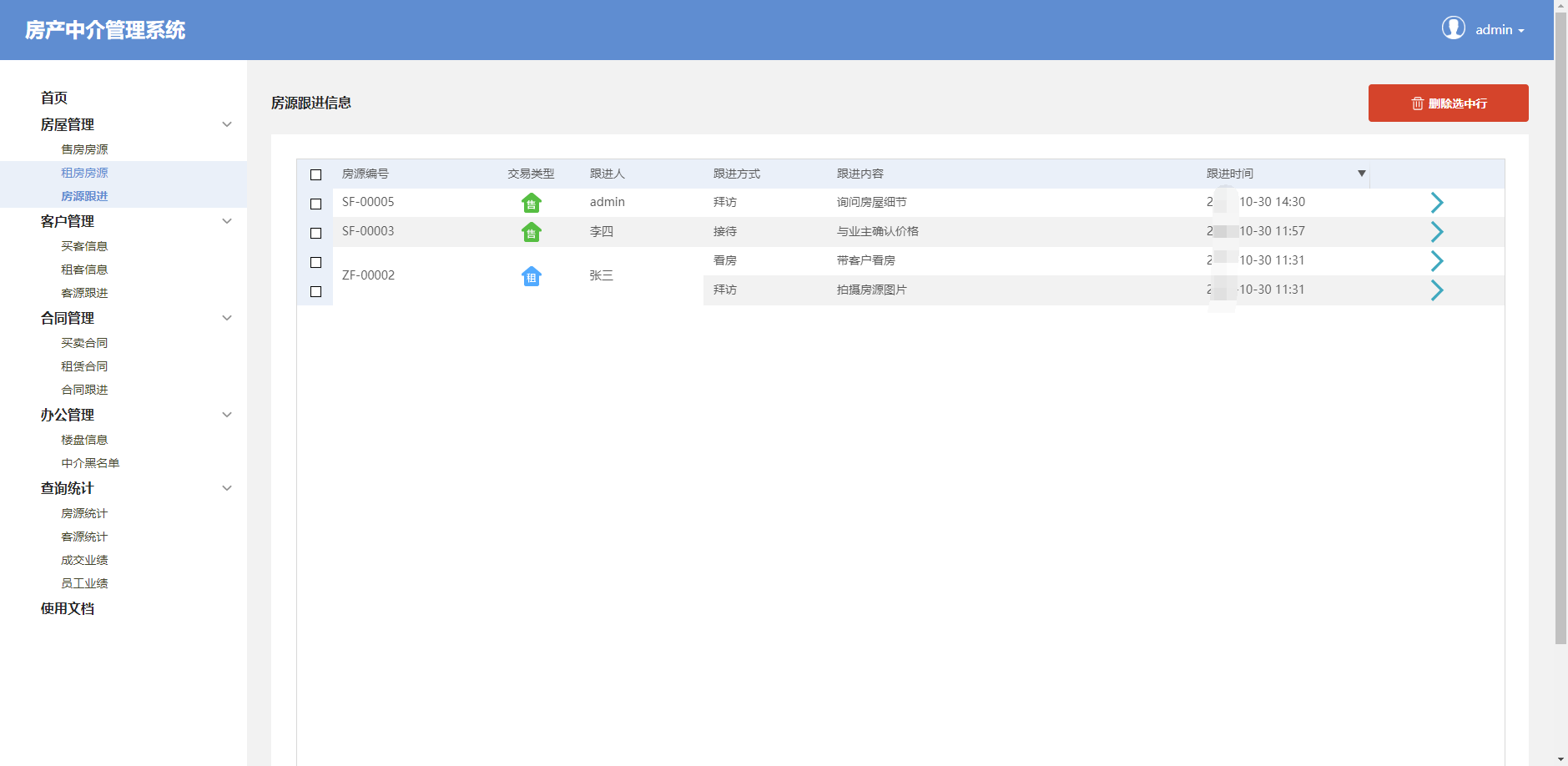 選擇「房屋管理->房源跟進(jìn)」,進(jìn)入房源跟進(jìn)信息列表頁(yè)面。