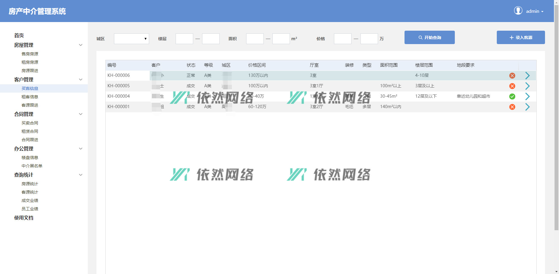 選擇「客戶管理->買客信息」,進(jìn)入買客客源列表頁(yè)面。您可以添加買客客源,也可以設(shè)置關(guān)鍵字查詢買客。