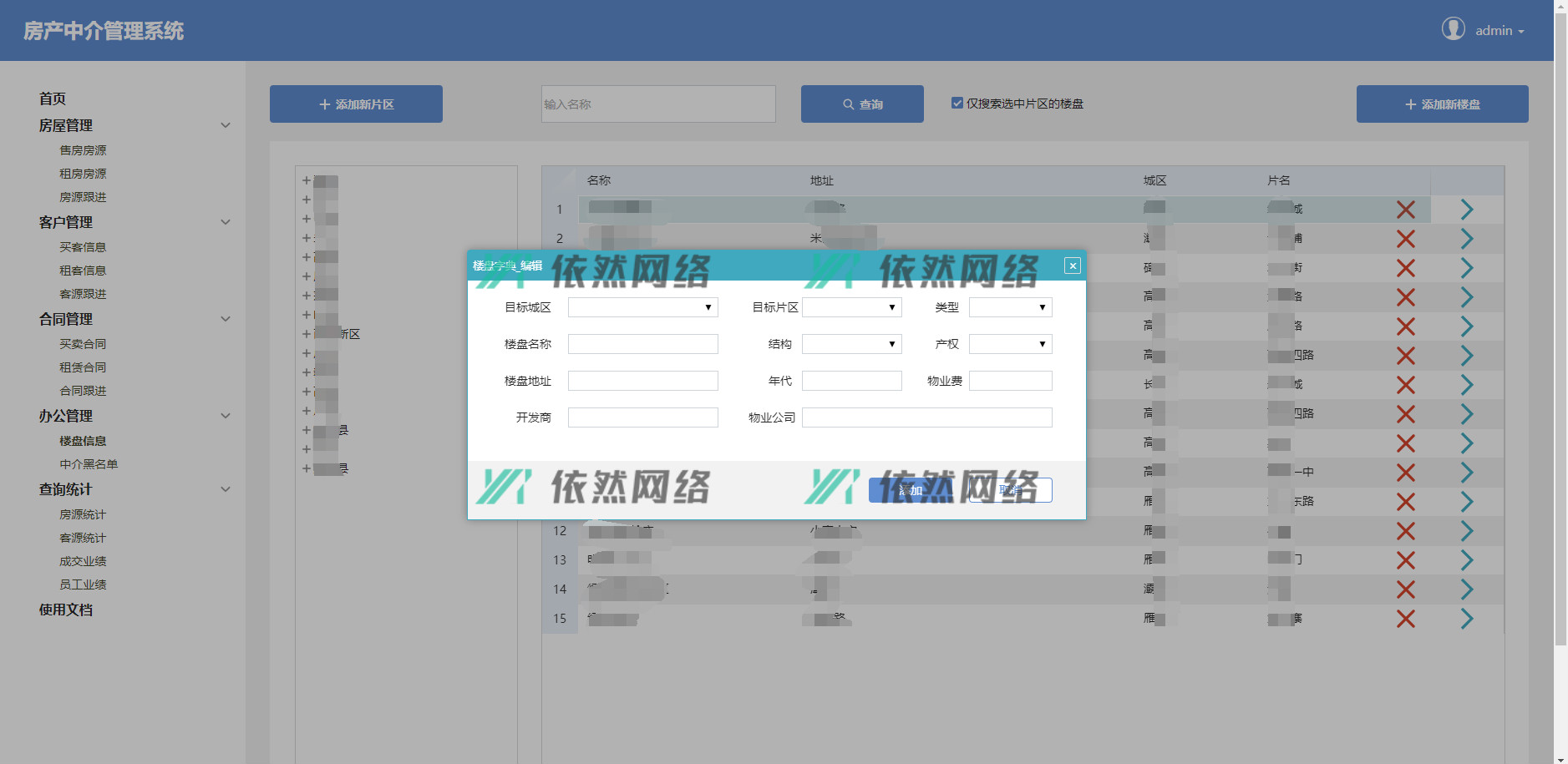 選擇「辦公管理->樓盤信息」,進(jìn)入樓盤列表頁(yè)面。您可以在左側(cè)的樹中選擇一個(gè)片區(qū),查看該片區(qū)內(nèi)的樓盤。
