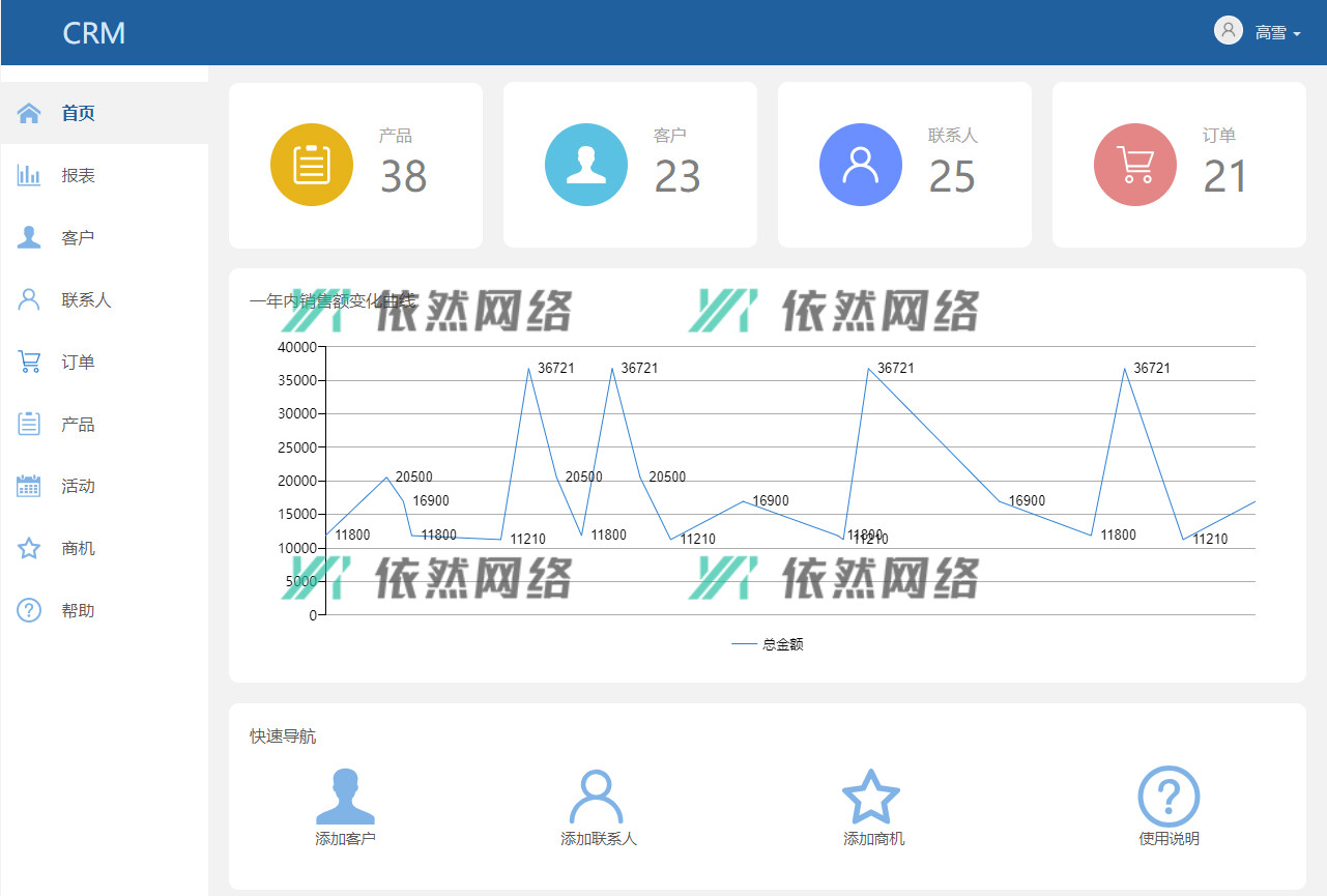 選擇「首頁」,在頁面上方可快速查看到系統(tǒng)中產(chǎn)品、客戶、聯(lián)系人和訂單的數(shù)據(jù),單擊可進(jìn)入相應(yīng)的模塊;中間的折線圖可以看出一年內(nèi)銷售額的變化;在下方的「快速導(dǎo)航」區(qū)域,單擊可快速進(jìn)入添加頁面或使用說明界面。