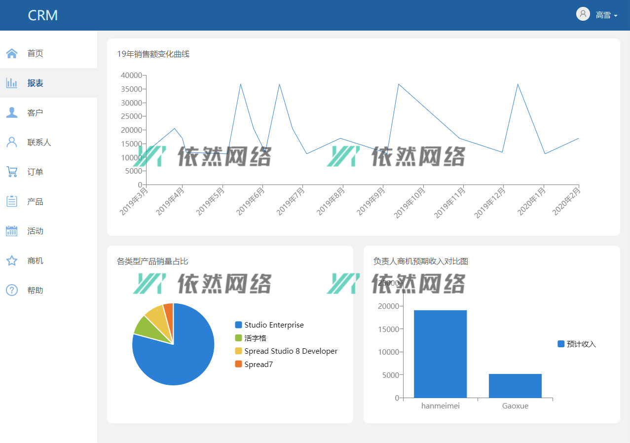 選擇「報(bào)表」,可以查看到19年銷售額變化曲線、各類型產(chǎn)品銷量占比和負(fù)責(zé)人商機(jī)收入對比圖,幫助您更快、更清晰的了解產(chǎn)品銷售情況。