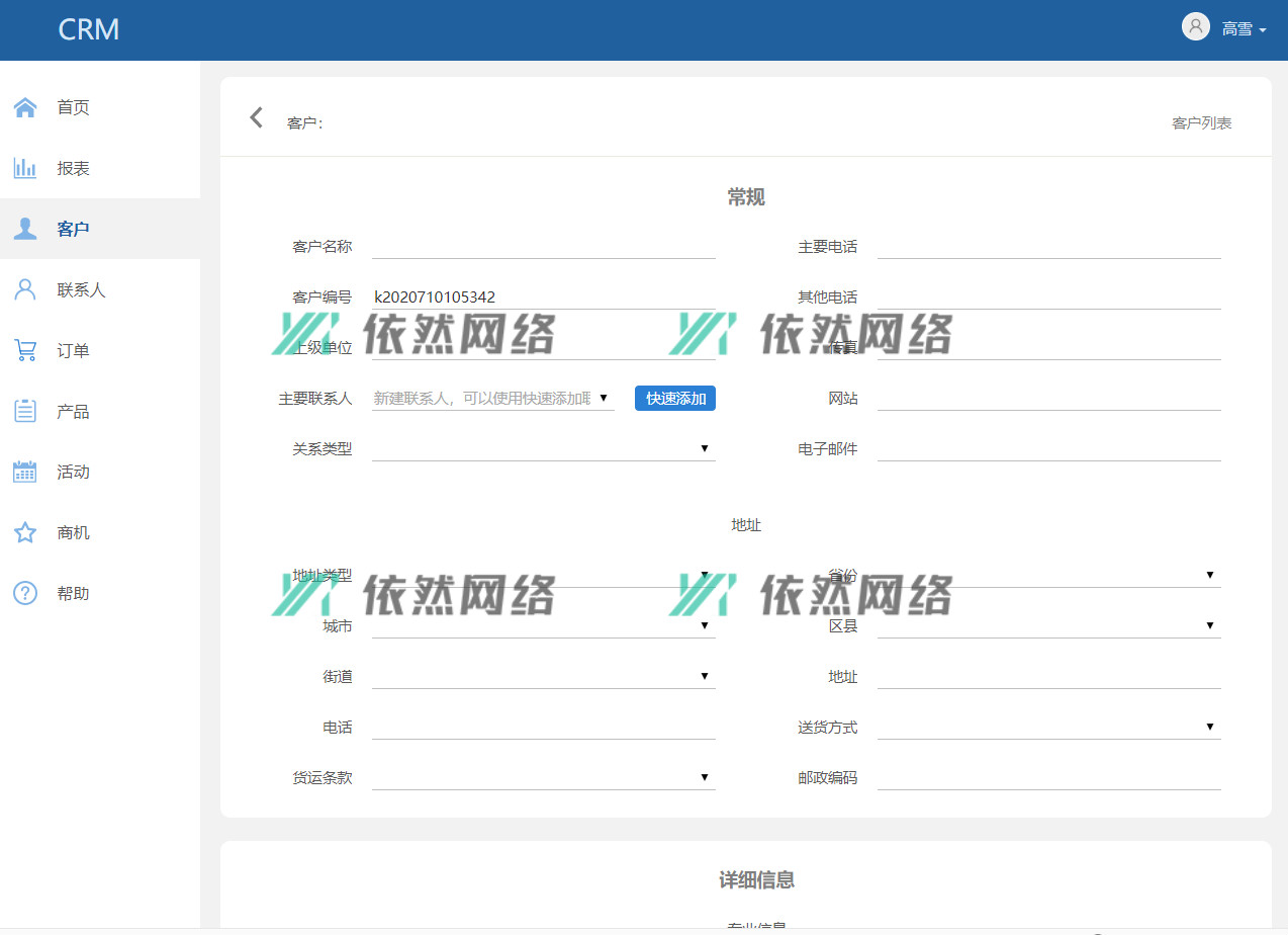 新增客戶:單擊「新增客戶」按鈕,會(huì)跳轉(zhuǎn)到新增客戶的頁面。輸入客戶的詳細(xì)信息后,單擊「確定」即可添加成功。