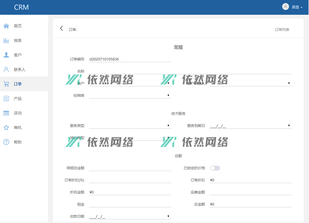 ?新增訂單:單擊「新增訂單」按鈕,會(huì)跳轉(zhuǎn)到新增訂單的頁面。輸入訂單的詳細(xì)信息后,單擊「確定」即可添加成功。