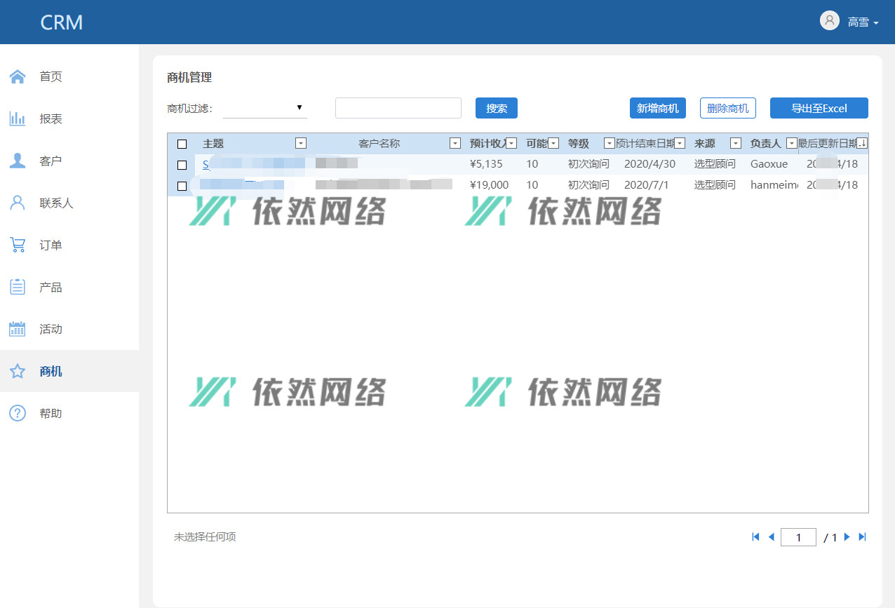 選擇「商機(jī)」,進(jìn)入商機(jī)管理界面,您可以看到所有商機(jī)的基本信息。您可以過濾出”我的商機(jī)“,或輸入關(guān)鍵字對商機(jī)進(jìn)行搜索。