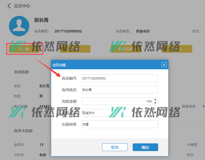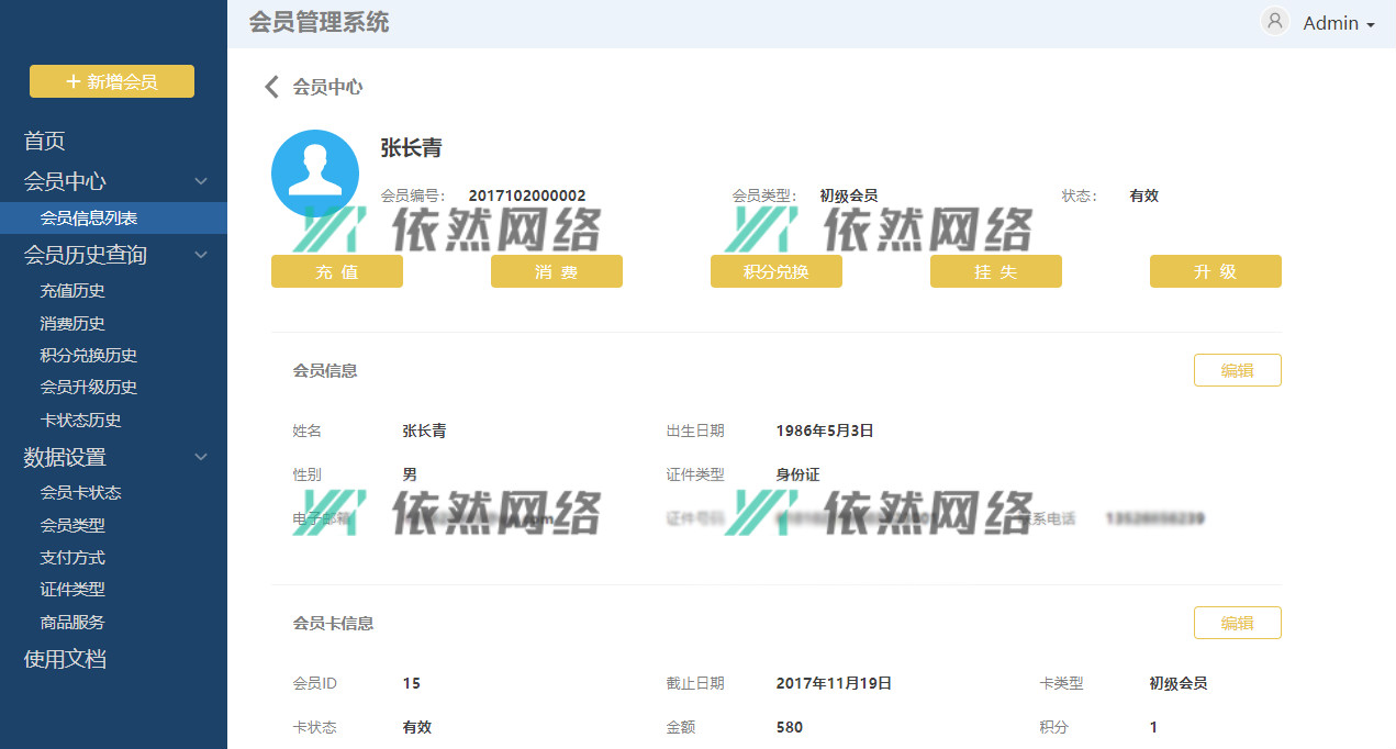 在首頁搜索會員,或者在「會員中心->會員信息列表」中單擊會員編號,進入會員詳情頁面。在會員詳情頁面可對會員進行一系列操作,包括查看和修改信息、充值、消費、積分兌換、掛失和升級等。每天晚上0點會根據(jù)會員卡到期日期自動更新會員卡狀態(tài)。