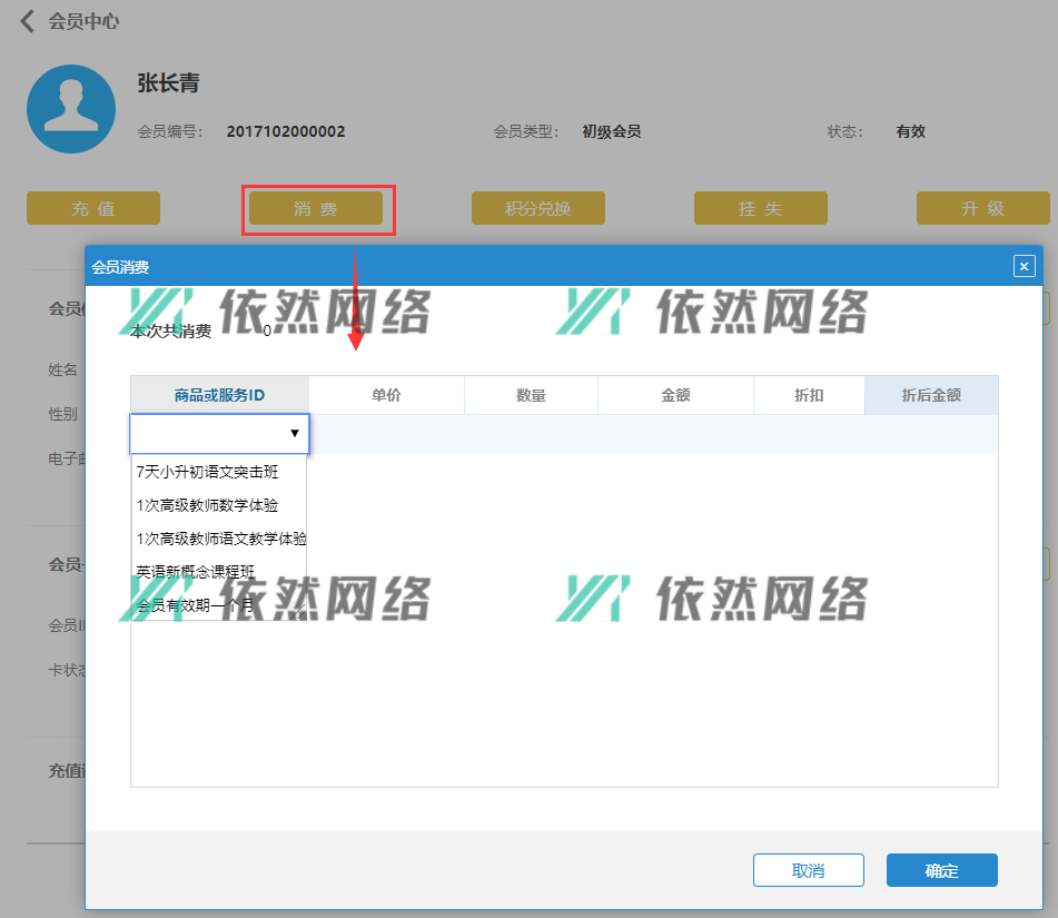 當會員卡的卡狀態(tài)為「有效」時,單擊「消費」后,在彈出的頁面中可選擇商品或服務進行消費。