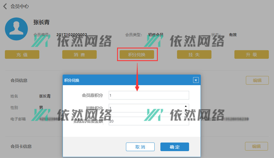 當會員卡的卡狀態(tài)為「有效」時,單擊「積分兌換」,可進行積分兌換操作。