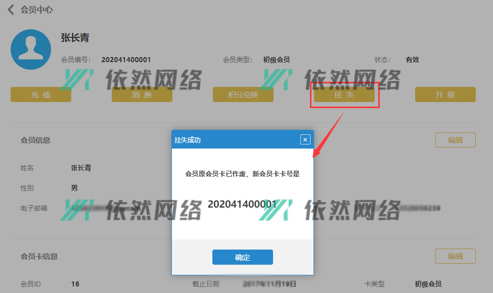 當會員卡的卡狀態(tài)為「有效」時,單擊「掛失」,可進行掛失操作。掛失之后原卡作廢,然后生成新的會員卡并保留原始數(shù)據(jù)。