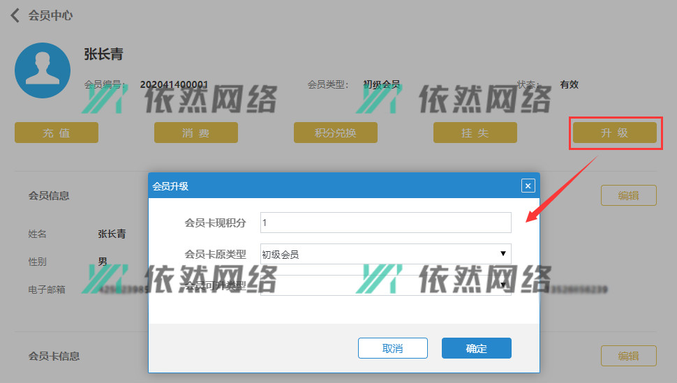 當會員卡的卡狀態(tài)為「有效」時,單擊「升級」,可進行升級操作。升級需滿足積分和等級條件,條件不滿足無法升級。