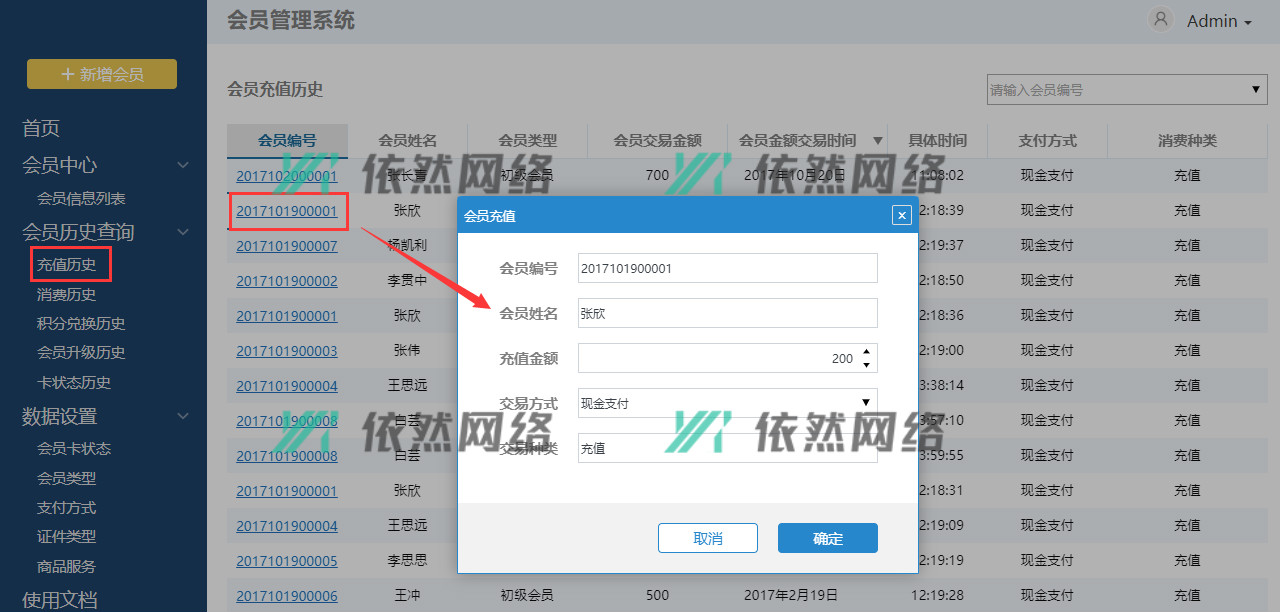 充值、消費、積分兌換、掛失和升級操作均會自動生成相對應的操作歷史。在「會員歷史查詢」中,選擇一種操作歷史,單擊會員編號可查看歷史記錄。