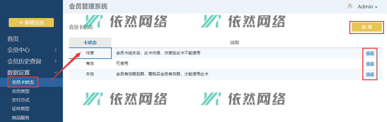 單擊「會員卡狀態(tài)」,在會員卡狀態(tài)列表中,可單擊「編輯」超鏈接對卡狀態(tài)進行編輯,也可以單擊「新增」按鈕添加卡狀態(tài)。