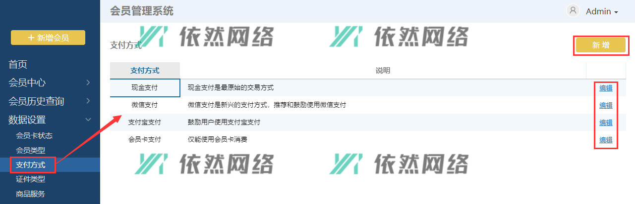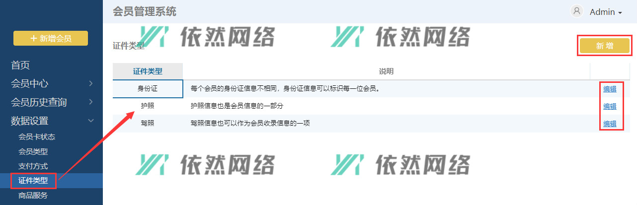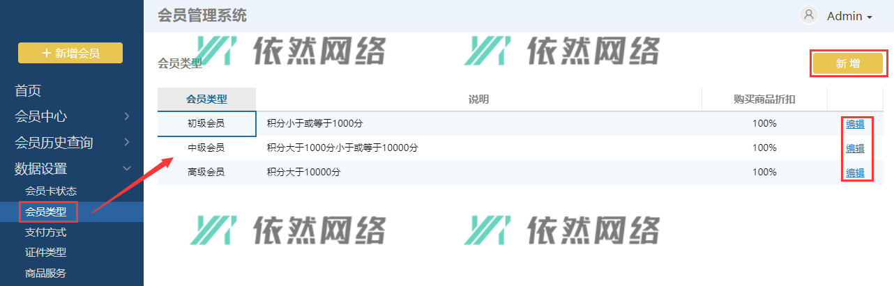 單擊「會員類型」,在會員類型列表中,可單擊「編輯」超鏈接對會員類型進行編輯,也可以單擊「新增」按鈕添加會員類型。