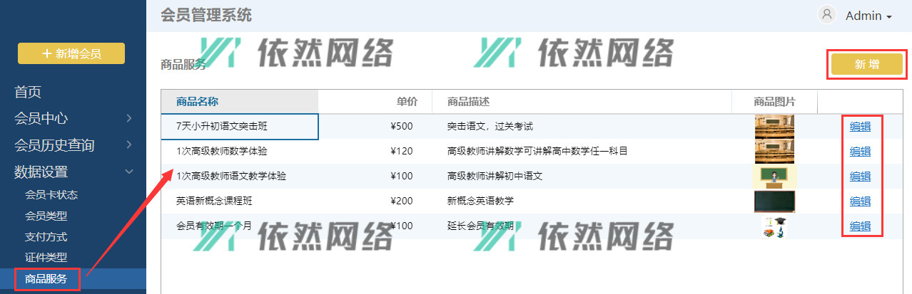 單擊「商品服務」,在商品服務列表中,可單擊「編輯」超鏈接對商品服務進行編輯,也可以單擊「新增」按鈕添加商品服務。